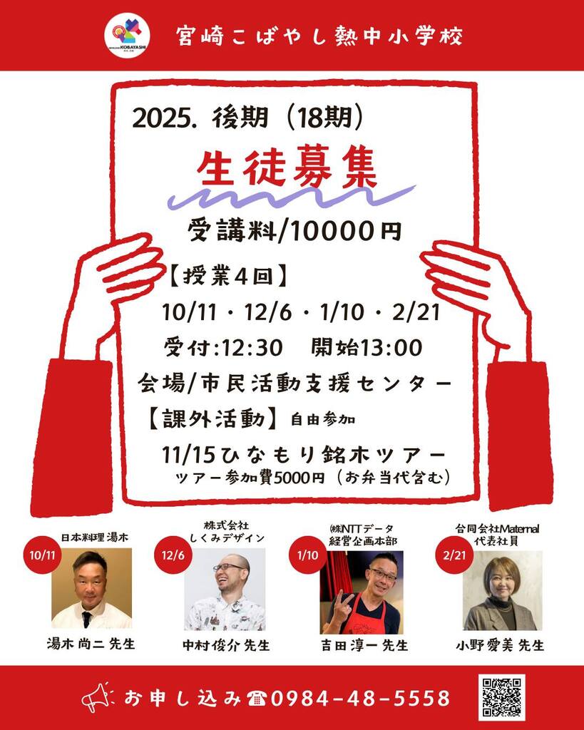 宮崎こばやし熱中小学校は小林市に限定しておりません。遠くは首都圏域からも通われている受講生の方もいらっしゃいます。小林市を含む西諸地域・宮崎県はもちろんのこと、九州そして日本全国を活性化し、世界の小林市を目指します。